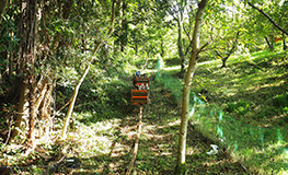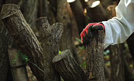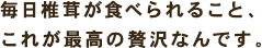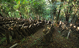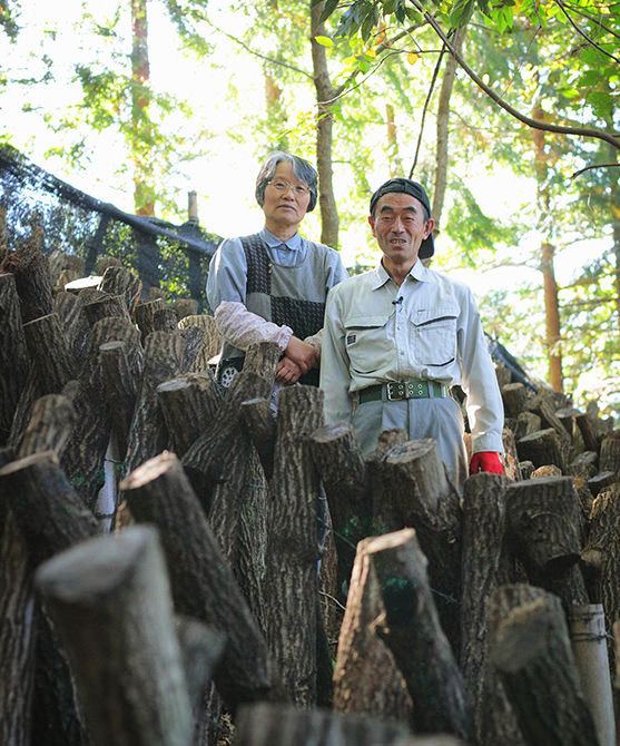 愛媛県のほぼ中央に位置する内子町。自然の多いこの町では、傾斜地をうまく利用した果樹園など農業が盛んな場所としても知られている。ここで50年近く椎茸を栽培している窪田さんがほだ場を構えている場所は、傾斜が45度に近いのではないかと思われるほどの急斜面だ。通常の人なら歩くのですらやっとのこの場所を、スイスイと足取り軽く自在に動き回る窪田さん。「なぜこんな急斜面にしたかというと、ここが雑木林だからなんですよ。杉や檜と違って12月上旬になるとこれらの落葉樹の葉が落ちて光が降り注ぐようになるんです。そしたら『早う芽きりよー芽ーきりよー』って話しかけてあげるんです」と笑う。「以前に比べると大分減らして管理が行き届く程度になった」とは言うものの、約2万本を天地返しもし、モノレールを駆使してほだ木の位置変えなどの作業を夫婦でこなしているというから驚きだ。またこの地域はスプリンクラーでの散水を必要とするが、急斜面ならではの高低差を利用して燃料を使わないでも水が回る方法を取り入れるなど、ハンディを逆にうまく利用するなかなかの策士だ。栽培をしていて一番嬉しい時は?と問うと、「なによりも収穫の時はわくわくしますね。あとは毎日欠かさず椎茸を食べるけんど、それが自分にとっての贅沢やと思うちょります」との答え。収穫時期は生のものを、時期外は乾椎茸が欠かさず食卓に並ぶ。冬の寒子などは焼肉の時に一緒に焼いて食べれば、肉よりも美味しいと言う人もいるそうだ。「辞めてしまう人も多いけど、今が正念場。ええものを作っている自信はあるから、それを続けていればいつかはまたちゃんと評価してもらえる日がくるはず」と、今日もほだ場に足を運ぶ。