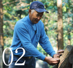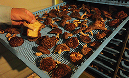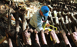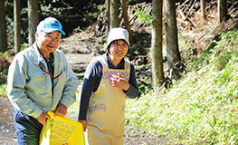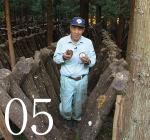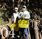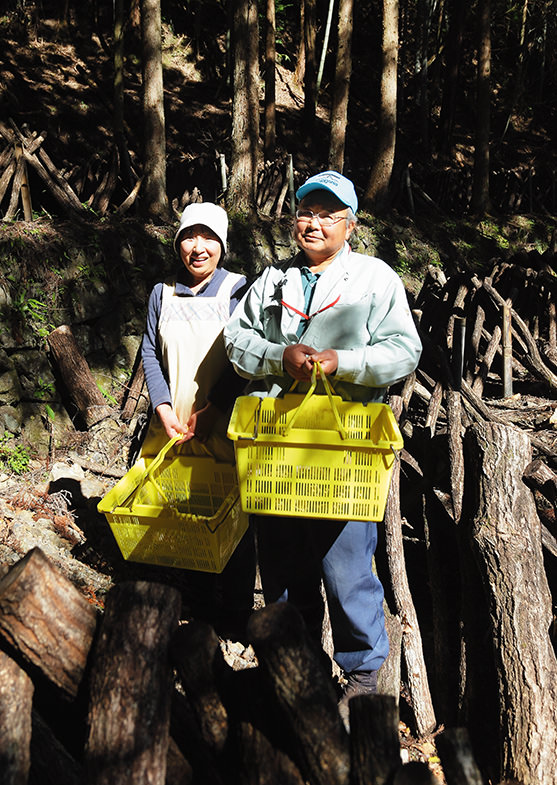 「ここ肱川は大洲の中でも、椎茸の生育にすごくむいている場所だと思うんですよ。朝は霧が発生するし、偏西風がここいらの山にぶつかって冬は雪が降るでしょう。だから湿度が程よくあるので、散水もほとんど必要ないんですよ」と教えてくれたのは中野さん。清流肱川に沿って段丘状になっているここは、一歩踏み外せば谷底まで落ちてしまいそうな急斜面や山が多い。それ故に米作などの農業には適さなかったため、自然と栗や椎茸が特産物になっている地域だ。代々この地域に住んでいる中野さんは20歳くらいまでは家業である椎茸栽培などを手伝い、その後就職。30年ほど務め上げたのち、脱サラして椎茸農家になった。実は森林組合に勤めていた事もあり、椎茸栽培に関する知識や経験は先輩方にもひけをとらない。現在は有効ほだ木は4万本ほど、5カ所のほだ場に分けて栽培している。実は昨年までは息子も手伝っていたそうだが「乾燥などの経費もいれるとキロ3,500円くらいの原価がかかるのに、実際の価格はその半分くらいになってしまった」という理由から働きに出ざるをえなくなったそう。身近でそんな問題にも直面したこともあり市場価格の低下に頭を抱えている一人でもある。とはいえ「能登半島の椎茸がものすごく高い値が付いとると聞いて食べてみたけど、ここいらの椎茸も全然負けとらん自信がある」と豪語する。実際、産直市に出した生椎茸は飛ぶように売れるそうで、「毎日大洲の『愛たい菜』に持って行くのが嬉しくて」と楽しそうに笑う美津保さん。「椎茸栽培の楽しさは自然の中で仕事ができる事」と断言する中野夫妻は、椎茸栽培の仕事の合間にイノシシ狩りや鮎獲りなどの趣味も楽しんでいるそうだ。